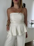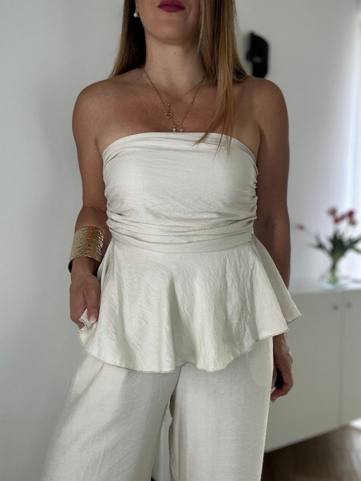 Il pezzo superiore è un top a fascia con un dettaglio distintivo: una balza ampia e fluida che crea un effetto mantella. Questo design non solo aggiunge volume e movimento, ma dona un’allure romantica e moderna allo stesso tempo.